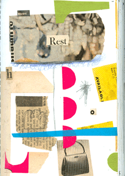 I do not claim to be a great writer. Believe me I'm not trying to critical here about my ability. The truth is it is not my goal to be a great writer, or even a great illustrator for that matter. What is most important for me is to JUST WRITE (and paint), to get things out and feel good about that. It is hard enough to sit down with my notebook and pen and let the words flow out onto the page, when I know no one will read them. Just thinking about doing that gives me little pangs of nervous excitement, sometimes followed by a second thought like, "I'm too tired right now", or "I'll do it later". In fact it is hard enough for me to sit here right now in front of my computer and continue to type this. I feel instantly compelled to clean up a pile of papers sitting next to me on the floor. Yet I know that I need to be here because there is something in it that feels important, this urge is much bigger than me. And it is strange to be on a path and not know where you are going. I just know I need to be here, just sharing my thoughts. When I haven't written for a long stretch of time I become easily frustrated with things, my attention span is shorter, as is my patience. It may take a while before I realize that it is the writing I am missing and not just p.m.s. Writing for me is connected to taking care of myself, and not doing it is a form of neglect. When I write I am happier, it is that simple. This has nothing to do with making a living, or being successful. This is about the simple process of getting stuff out. (a five minute collage from my journal)